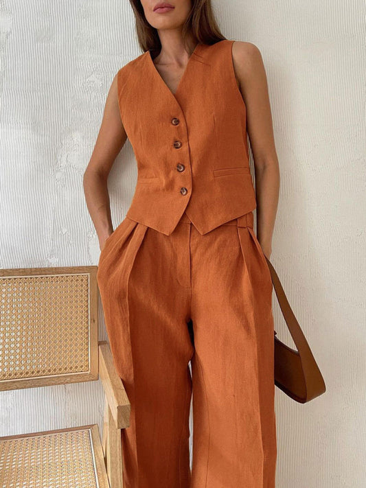 Classic V-neck Pleated Cotton and Linen Wide-leg Trousers Suit
