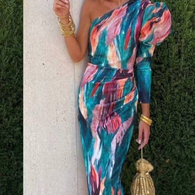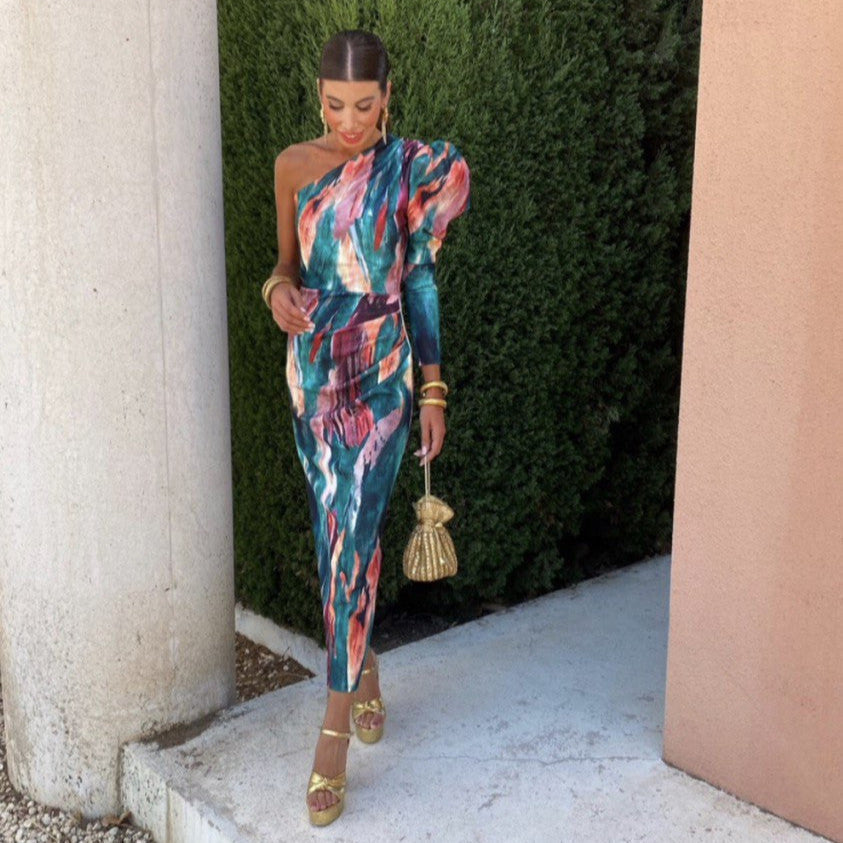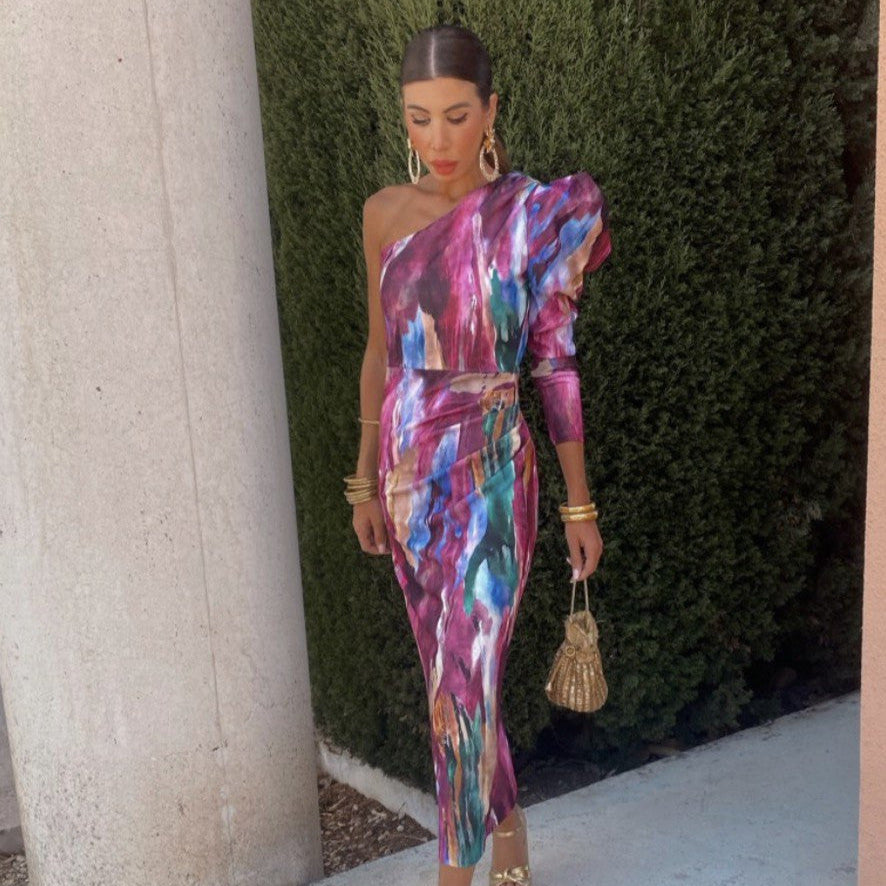• Unforgettable silhouette with one shoulder and bold purple prints